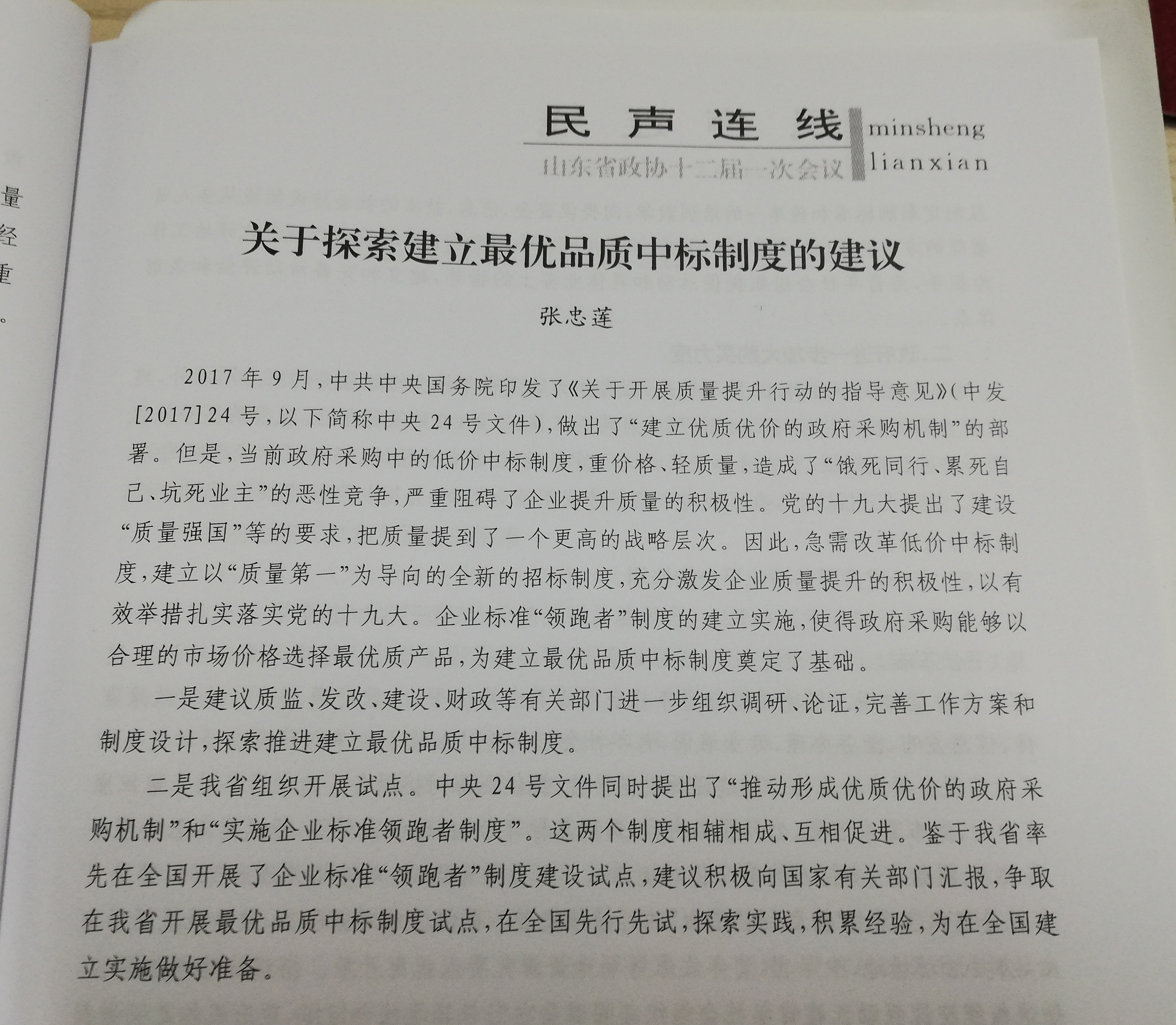 前期,我會通過調研發現,當前政府采購中的低價中標制度,重價格、輕質量,造成了“餓死同行、累死自己、坑死業主”的惡性競爭,嚴重阻礙了企業提升質量的積極性。黨的十九大提出了“建設質量強國”的要求,把質量提到了一個更高的戰略層次。因此,急需改革這種低價中標制度,建立以“質量第一”為導向的全新的招標制度,充分激發企業質量提升的積極性。在此基礎上,我會整理提交《關于在政府采購中探索建立最優品質中標制度的思考與建議》,該建議分析了建立最優品質中標制度的背景、形勢和目標,按照建立優質優價的政府采購機制的要求,提出了最優品質中標制度建設的總體構想、基本內涵和制度框架,論證了最優品質中標制度是落實“質量第一”理念、迎接高質量發展時代、建設質量強國的重要舉措。建議榮獲2017年度山東省政府系統優秀調研成果一等獎,并由人大代表提交兩會。