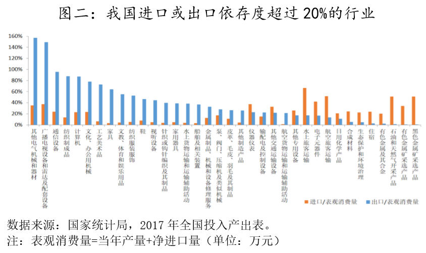 產業層面看,國內相當多行業不具備在沒有外部原料零部件供給、沒有外部市場需求條件下生存的能力。根據國家統計局發布的2017年投入產出表行業分類,在我國149個行業中,有36個行業的進口或出口依存度超過20%,某些行業的出口依存度甚至超過100%。