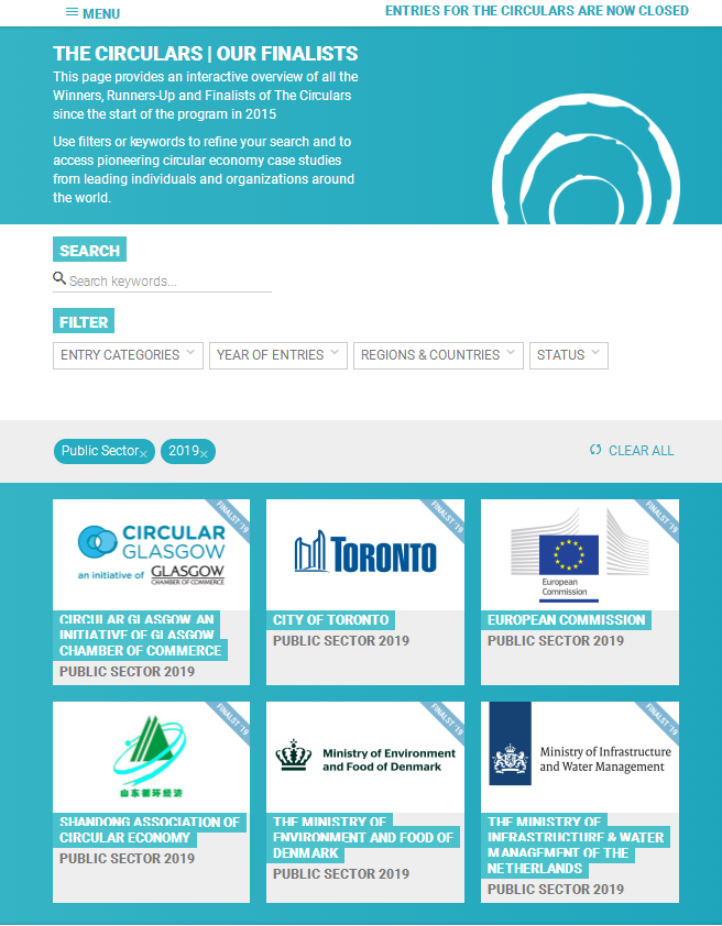 “全球循環經濟獎”由達沃斯世界經濟論壇和全球青年領袖論壇聯合發起,攜手埃森哲戰略共同舉辦,旨在表彰在商業和社會領域中為循環經濟做出杰出貢獻的個人、企業或組織,以推動循環經濟在全球的發展,現已成為全球最具影響力的循環經濟評獎項目,獎項共設立七個不同類別,分別是領導力獎、跨國公司獎、中小企業獎、公共部門獎、投資者獎、技術顛覆獎和大眾選擇獎。其評審委員會委員來自世界經濟論壇、全球青年領袖小組、全球商界代表以及社會各界的權威專家。