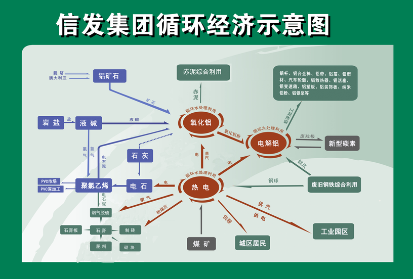 信發集團立足實體經濟,以循環經濟理念構建產業,瞄準國際先進水平,堅持清潔高效環保發展,是國家第一批“資源節約型、環境友好型”示范試點企業,是國家級生態型循環鋁工業示范基地,是國家資源綜合利用“雙百工程”骨干企業。