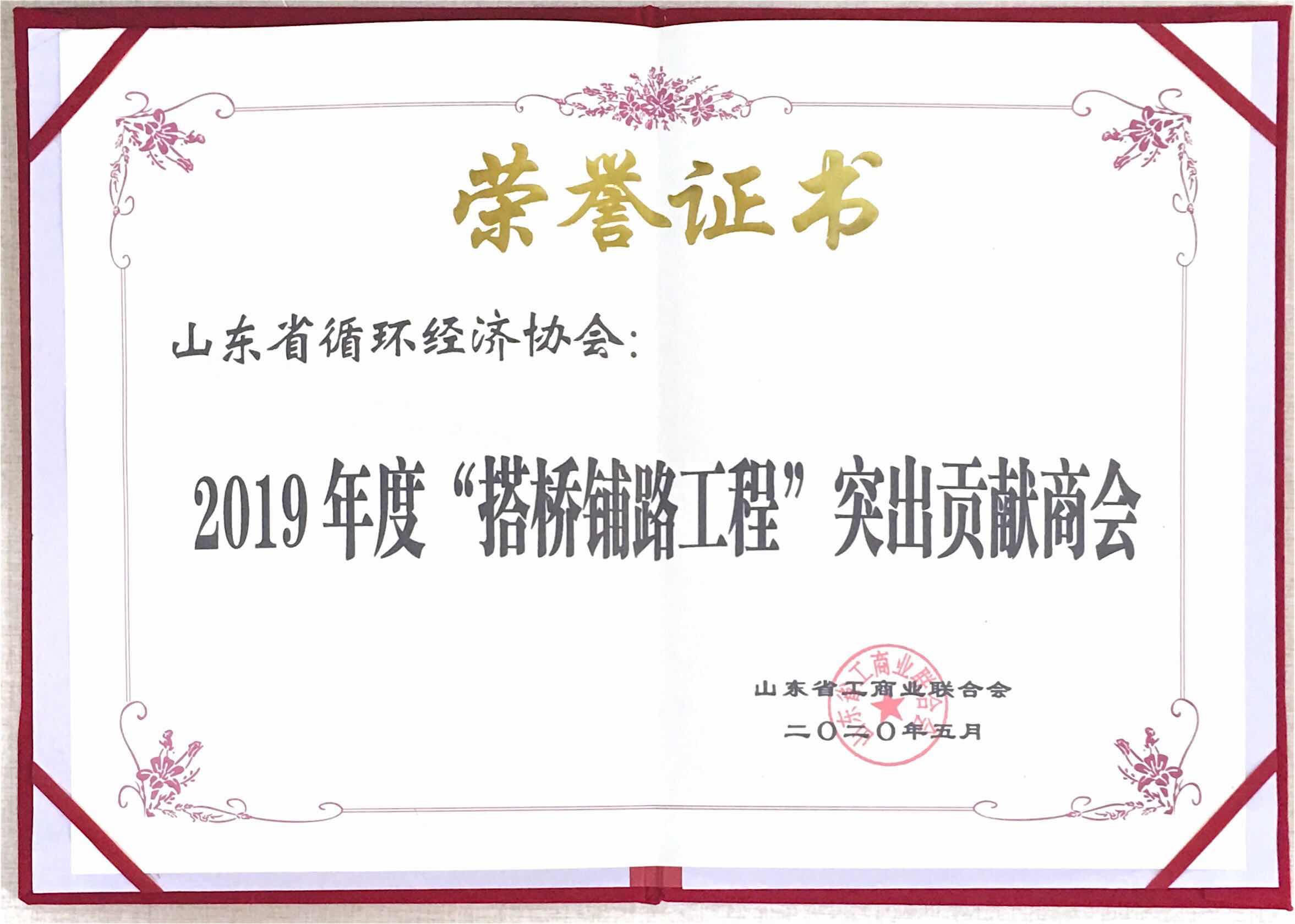 山東省循環經濟協會深入實施“搭橋鋪路工程”,主動“走出去”“引進來”,為山東省高質量發展做出了突出貢獻,榮獲2019年度“搭橋鋪路工程”突出貢獻商會。