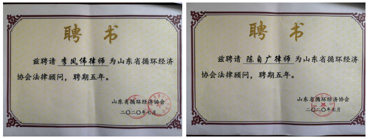 我會聘請山東舜翔律師事務所李鳳偉、陳自廣兩位律師擔任常年法律顧問為協會及會員單位提供法律服務。為助力循環經濟行業企業快速發展,幫助行業、企業把好法律風險關,為企業合規經營提供法律支持,為山東省新舊動能轉換貢獻自己的力量。