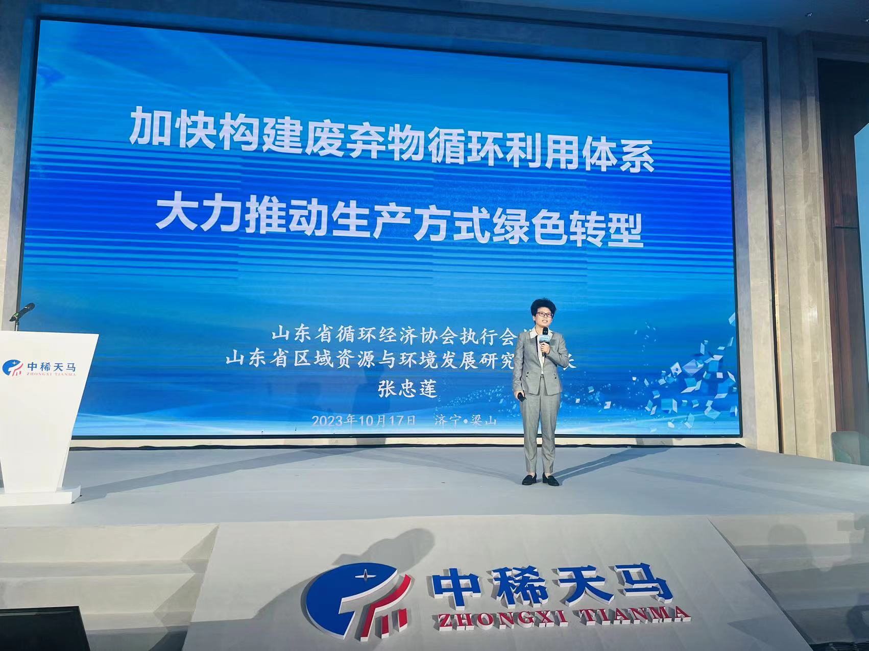 張忠蓮會長以《加快構建廢棄物循環利用體系,大力推動生產方式綠色轉型》為題,從實現綠色發展、高質量發展、應對世界政治經濟變局、構建綠色低碳循環發展經濟體系等方面闡述了循環經濟的戰略意義,介紹相關國家政策,分析循環經濟發展現狀以及發展趨勢,并簡要介紹了山東省循環經濟協會和梁山稀土產業園。