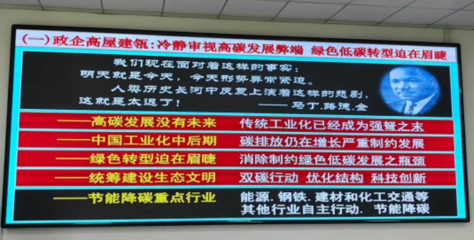 啟動儀式上邀請了環保部原政策法規司、生態司司長彭近新做了“應對全球氣候變暖危機 推進高質量可持續發展 企業擔當綠色低碳發展和雙碳行動中流砥柱作用”的第一次雙碳大講堂講課,通過基地集中培訓方式,宣講政策、剖析形勢、研究對策、提供方法,不斷強化綠色低碳意識,夯實全社會節能減排思想基礎,自覺養成良好生活習慣,加快推動我省綠色低碳循環經濟體系構建自覺投身美麗中國建設。