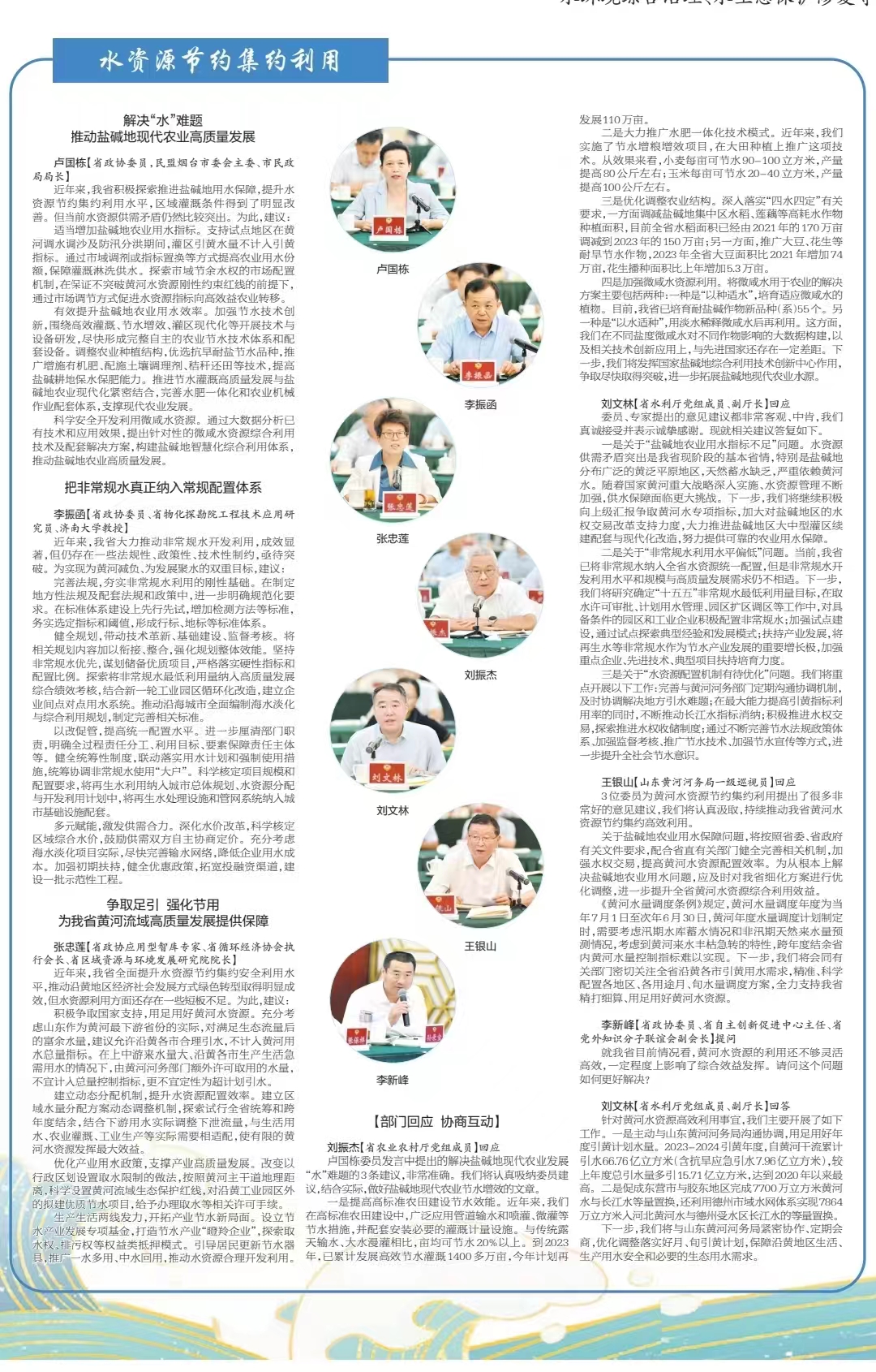 會上,政協委員、智庫專家盧國棟、李振函、張忠蓮、李新峰、張建、馮英明、蔣文強、李斌、劉美華、王衛東、謝剛、徐征和、孫錄寶分別發言,圍繞水資源節約集約利用、水環境綜合治理、水生態保護修復等提出建議,與省自然資源廳、省生態環境廳、省住房城鄉建設廳、省水利廳、省農業農村廳、山東黃河河務局負責同志協商交流,共商務實舉措。省紀委監委,省委省政府督查辦負責同志到會聽取意見建議。